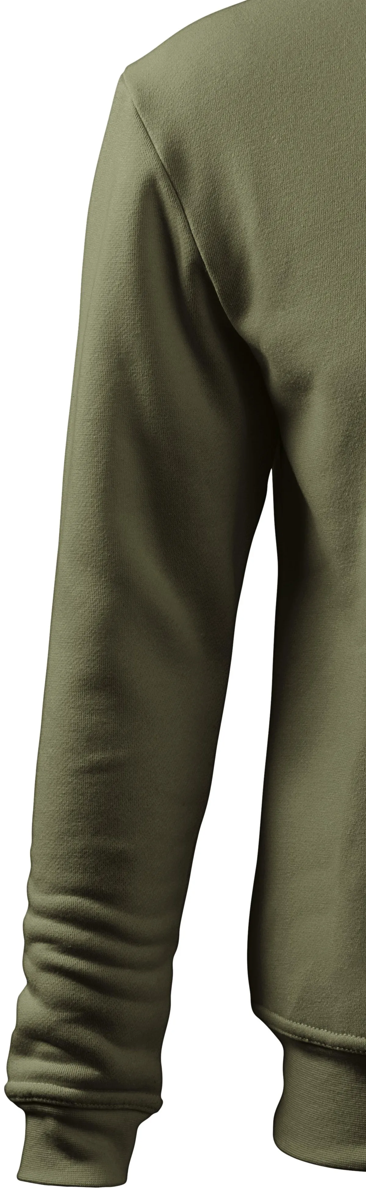 Суитшъртът с ръкави тип „капачка“, без качулка, е с класически дълги ръкави, завършени с ребрена плетка с добавка на 5% еластан, което спомага за поддържане на формата и предотвратява проникването на студ.
